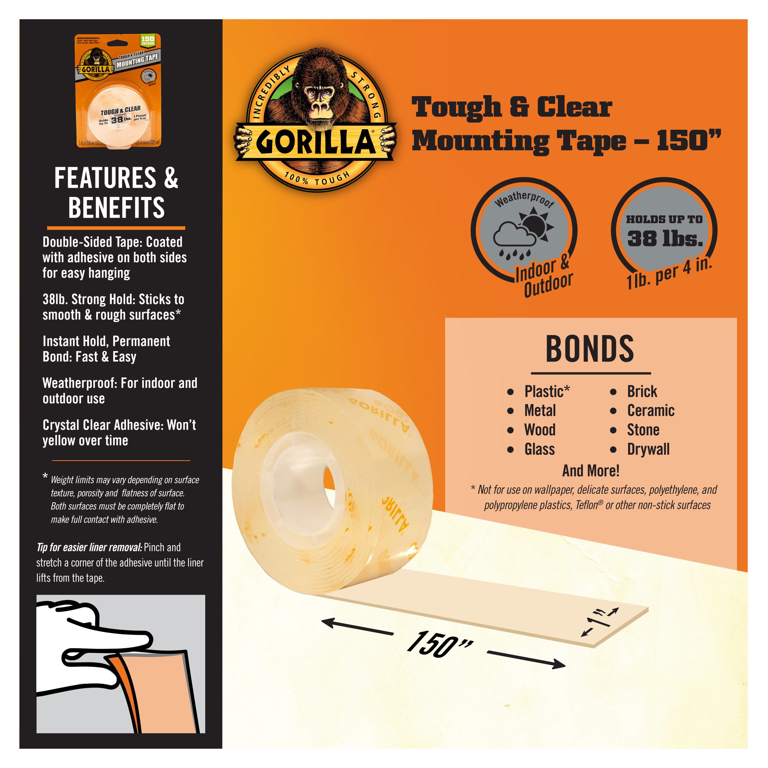 Gorilla Mounting Tape is a permanent tape and may cause surface damage or leave residue if removed. If Mounting Tape must be removed, the mounted object should be removed first, which is best be achieved by prying from one corner. Mounting tape can then be removed by slowly stretching the tape away from the surface.