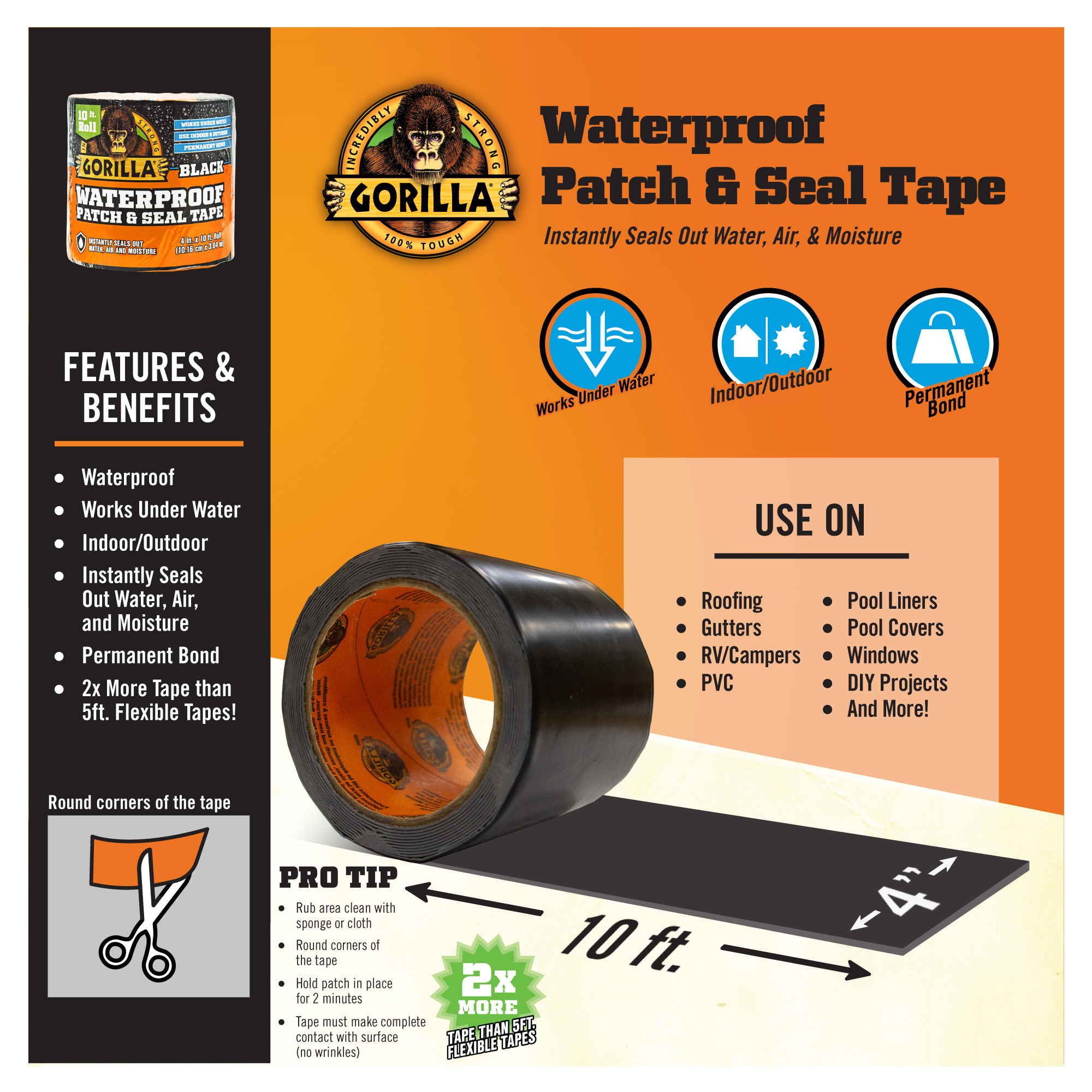 Gorilla Waterproof Patch & Seal Tape is the extra-strong adhesive tape designed to patch holes, cracks, gaps and tears. The rubberised, UV-resistant backing can be flexed and stretched to adapt to your surfaces – forming a permanent waterproof, airtight* barrier. Great for: roofing, gutters, drainage pipes, tarpaulin, trailers, camping, pond liners and much more! *Reduced if porous material