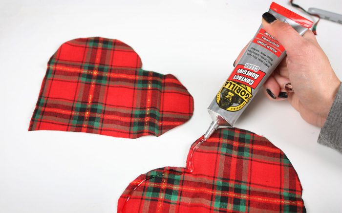 3. Apply Gorilla Contact Adhesive slightly in from the edge of both fabric shapes, ensuring you leave a small gap to fill with stuffing. Leave the glue for a couple of minutes, then line the two pieces of fabric up. Press the two pieces together, allowing the Contact Adhesive to spread a little to the edge, but still allowing a small gap to enable stuffing once dried.