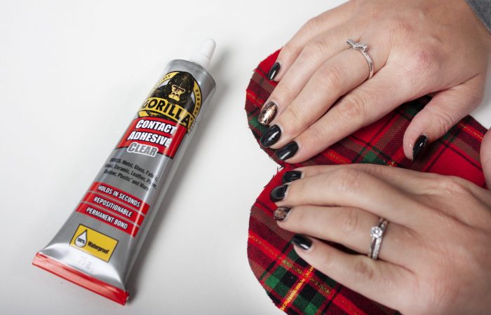 2. Cut a length of ribbon ensuring it is long enough to hang your decoration. You will then need to glue it to the top of each piece of fabric, apply a small amount of Gorilla Contact Adhesive to the ribbon as well as the fabric where the shape will hang from. Leave for two minutes to allow the glue to become tacky. This will achieve a stronger bond. Line up the ribbon with the fabric shapes, and lightly press the two surfaces together.