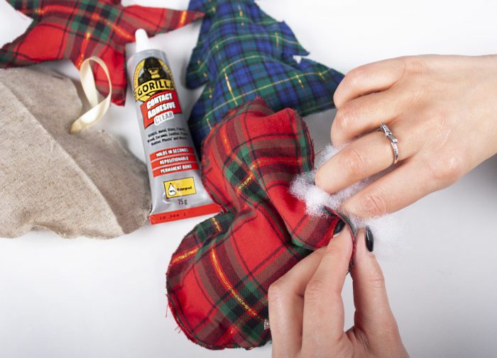 4. Begin to fill with stuffing once the glue has dried (allow at least 15-20 minutes). Make sure that the stuffing fills the entire shape. You may need to push the stuffing into any corners to ensure it’s evenly distributed. When your decoration is filled with stuffing, you can seal the gap by applying some contact adhesive to both pieces of fabric. Again, after two minutes lightly press these together to seal the shape.