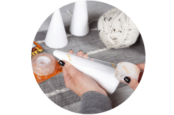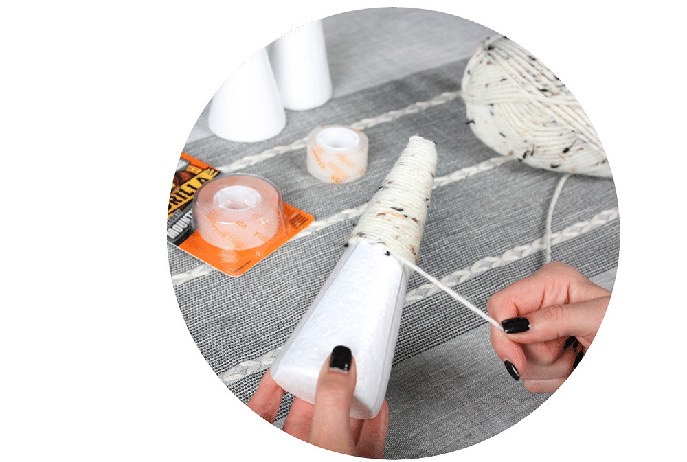 2. Place the end of the wool at the top of the cone and press it into the Mounting Tape for a few seconds. Hold the length of wool tight in one hand whilst spinning the cone with the other so that the wool starts to wrap around the cone. Continue this motion until the cone is covered, ensuring the wool lines up tight to the previous turn. Once the cone is completely covered, cut the wool at the base, ensuring the loose end is secured to the Mounting Tape.